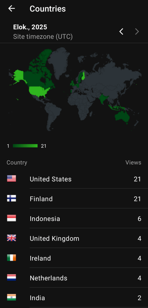 Top 11 countries Top 11 countries United States – Yhdysvallat Finland – Suomi Indonesia United Kingdom – Englanti Ireland – Irlanti Netherlands – Alankomaat India – Intia Canada – Kanada Australia Belgium – Belgia Sweden – Ruotsi